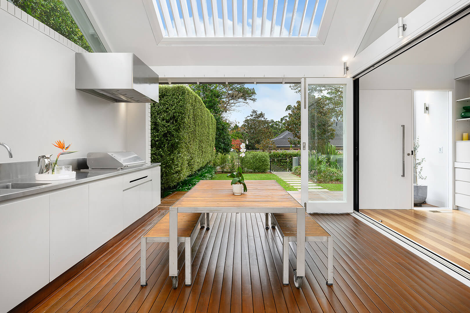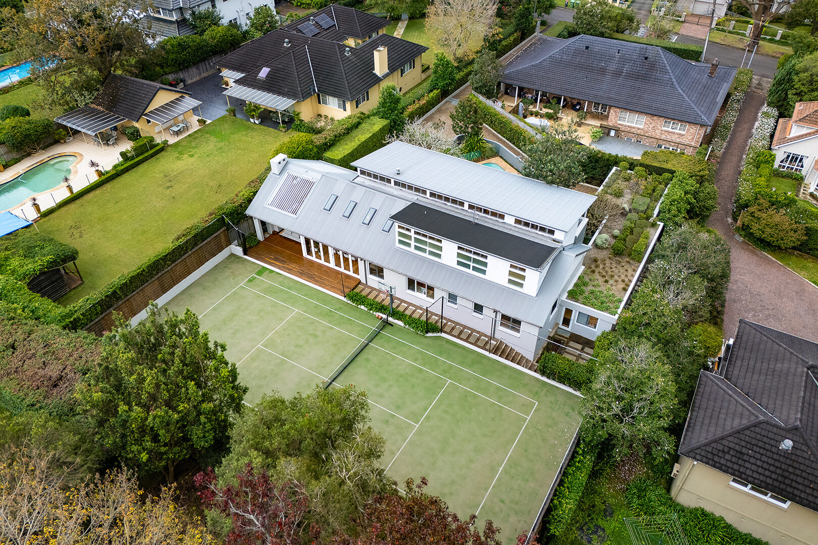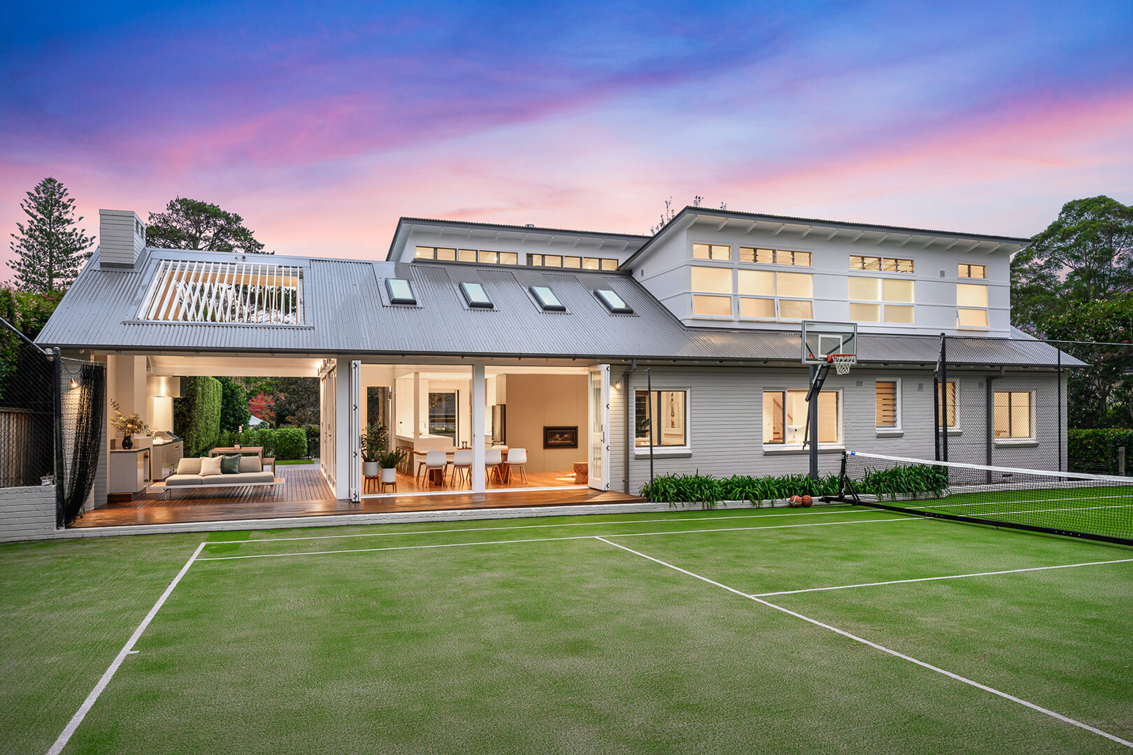 The project transformed a dated family home with existing tennis court and pool into a generous entertainer’s paradise.