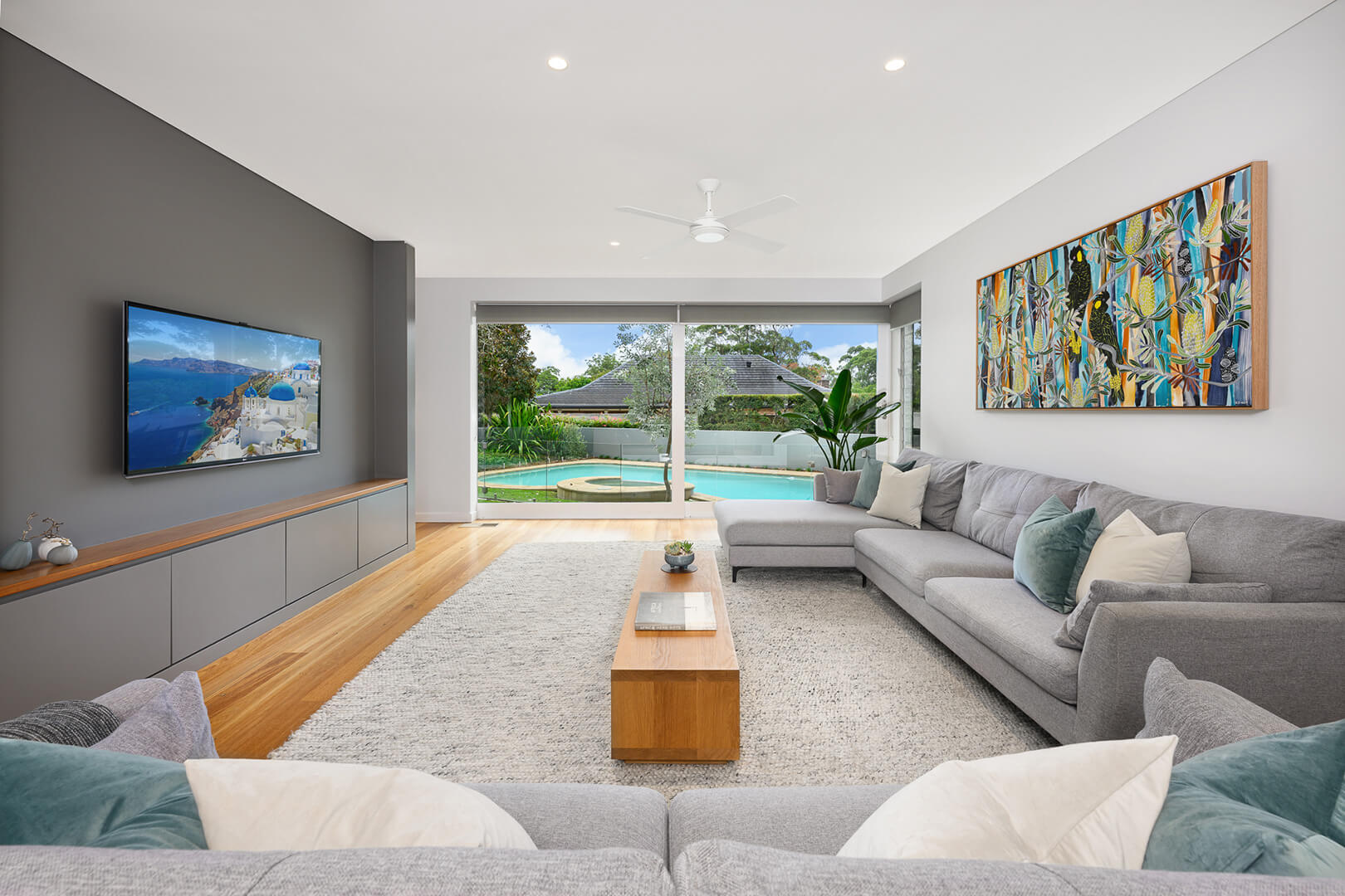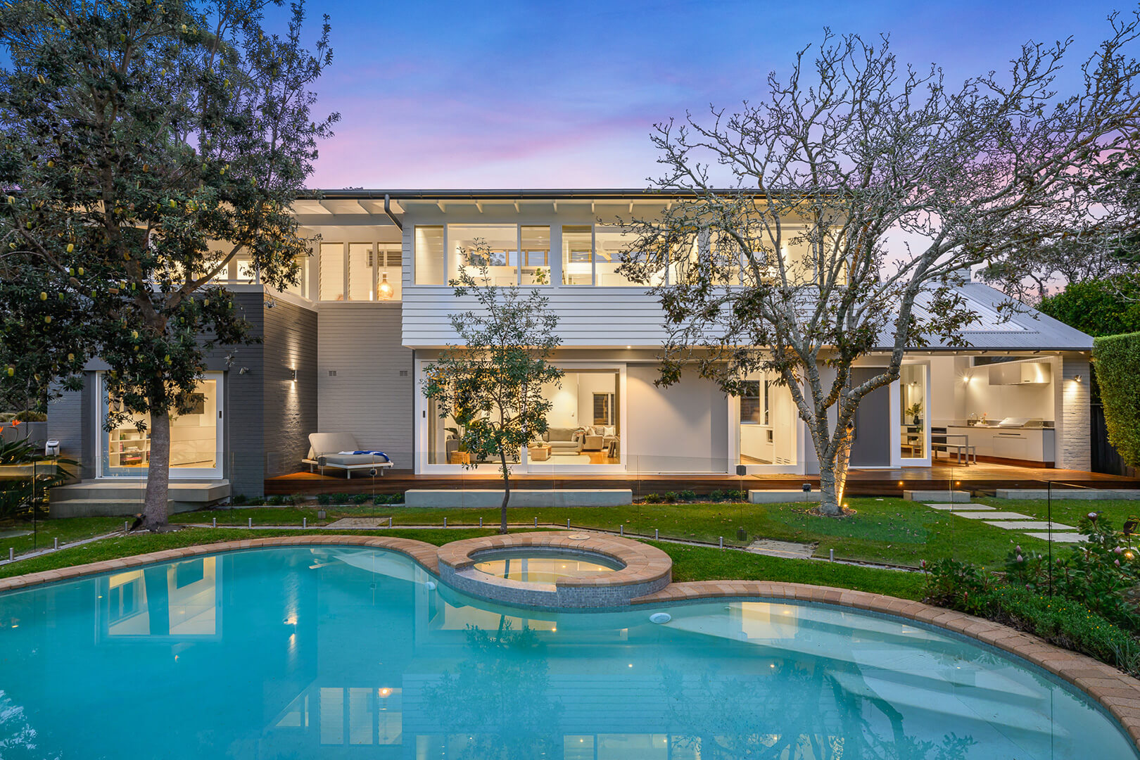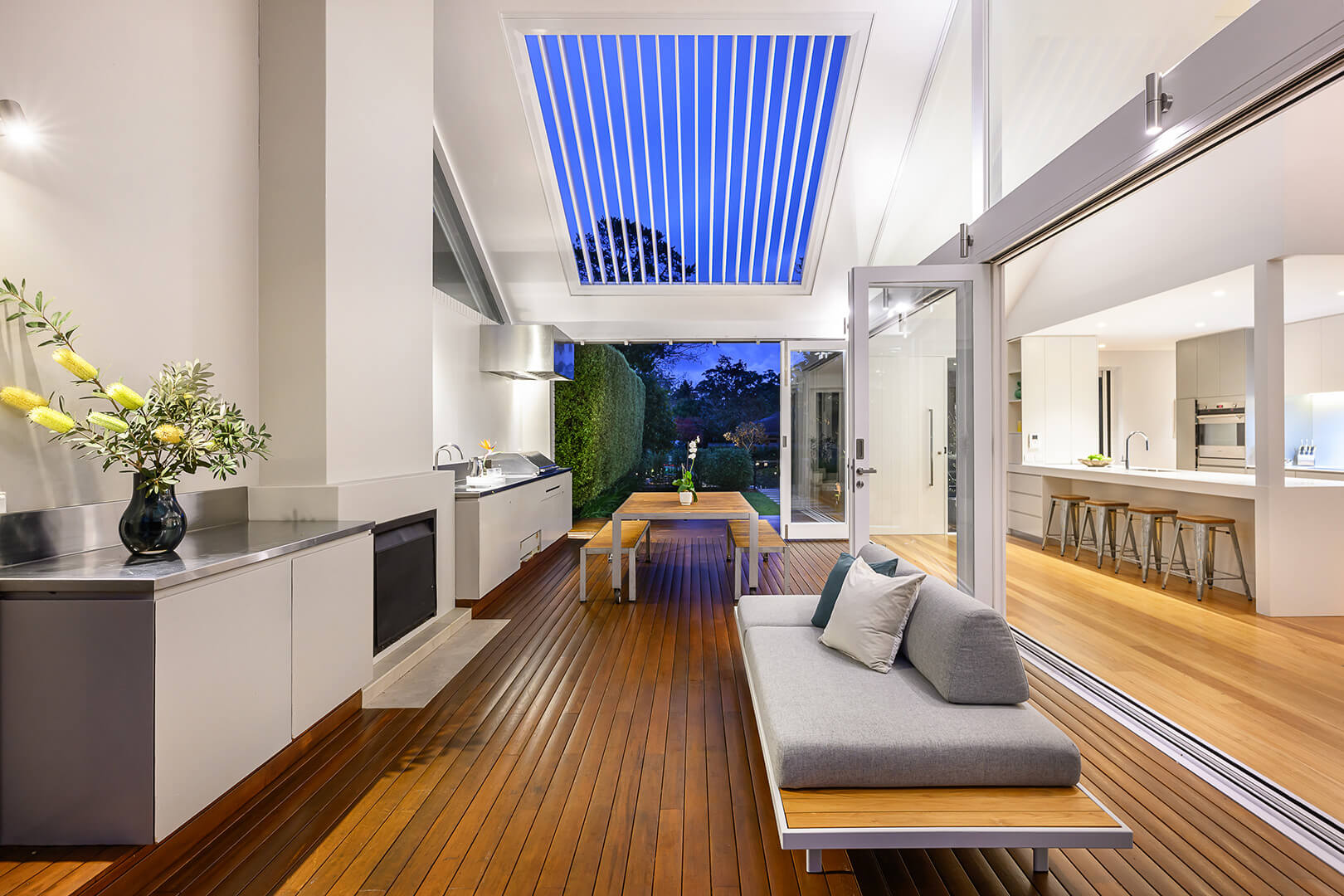 The project transformed a dated family home with existing tennis court and pool into a generous entertainer’s paradise.