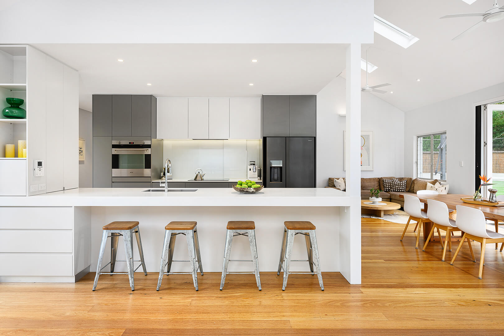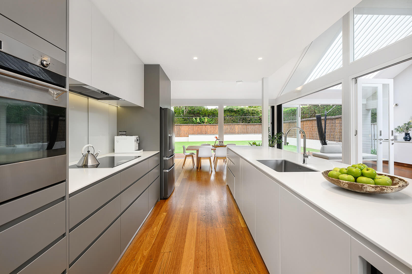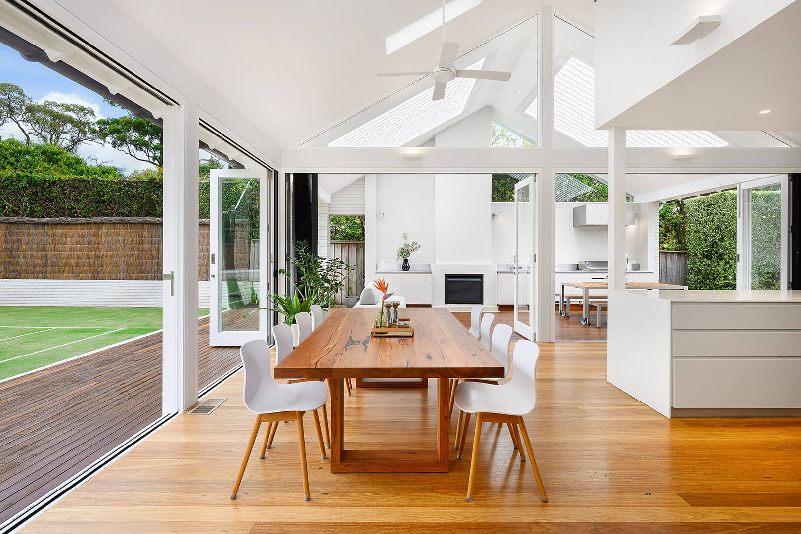 This project transformed a dated family home with an existing tennis court and pool into a generous entertainer’s paradise. Retaining the best parts of the property, this design reimagined how the home could connect to the outdoor areas and garden. The garage was relocated below the garden level, allowing a generous outdoor living area to take centre-stage. Sheltered under the original gable roof these areas connect to the garden, pool and tennis court and provide thermal comfort throughout the year.